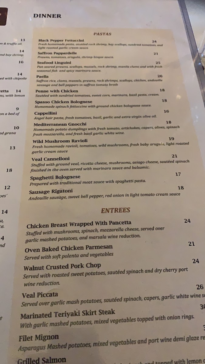 At Spasso, the menu is a delightful exploration of Italy’s culinary treasures. Start your meal with their flavorful Black Pepper Fettuccini, featuring fresh homemade pasta tossed with sautéed rock shrimp and bay scallops, enveloped in a light roasted garlic cream sauce that tantalizes the taste buds. Or savor the Seafood Linguini, an extravagant ensemble of pan-seared prawns, scallops, mussels, and clams swimming in a spicy marinara sauce that will engage your senses with each delectable bite. Another standout dish is the Veal Cannelloni, filled with rich flavor and tender meat that brings a comforting heartiness to your meal.